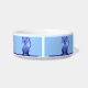 Une image de sourire de chat bleu de bande dessinée mignonne avec ses yeux s'est fermée, regardant très satisfaite, des répétitions sur ce bol fait sur commande en céramique d'aliments pour chats. Il y a de 6 d'entre elles allant presque complètement autour du plat. Il a la pièce pour le nom de votre minou au milieu. Remplacez le nom d'échantillon dans le modèle.