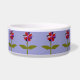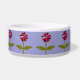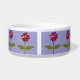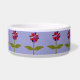 Ce magnifique bol d'animal de compagnie présente l'image numérique d'une marguerite avec une tige verte avec deux feuilles verts et des pétales violets, rouges et noirs avec un centre violet. Les pétales semblent être faits de plastique brillant qui a attrapé la lumière et a causé un effet irisé. L'arrière - plan est d'un bleu apaisant.