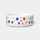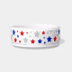 Un bol pour animaux décoratif orné d'étoiles rouges, blanches et bleues.