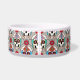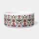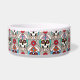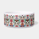 Cette oeuvre à motifs graphiques présente un crâne à sucre illustré, ou calavera, décoré de perles et de fleurs ainsi qu'une croix chrétienne sur chaque front. Ce motif est couramment utilisé lors des célébrations du Jour des Morts ou Dia de los Muertos, un jour férié latino-américain.