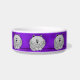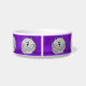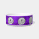 Cette cuvette personnalisée en céramique faite sur commande mignonne d'animal familier a de gros chats gris lunatiques de bande dessinée se reposer avec ses pattes rempliées dessous et sa queue enveloppée autour, sur un arrière - plan pourpre. Il y a plusieurs de elles autour du plat.