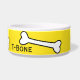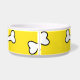 Bol d'eau/nourriture pour chien en céramique blanche, jaune, autour de l'extérieur. Des images d'os de dessins animés, courent autour de l'extérieur du bol. Le texte personnalisé noir, à l'avant, est prêt à personnaliser, pour votre animal de compagnie ou comme une idée de cadeau pour tout propriétaire d'animal de compagnie. Des produits assortis pour animaux de compagnie sont disponibles.