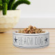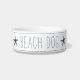 Un bol pour chien de style côtier mignon pour votre maison de plage ou résidence insulaire comporte les mots "chien de plage" dans un lettrage de style ferme de Harbour Harbour bleu fumé sur un fond blanc accentué de fines rayures navy et une paire d'étoiles de mer.