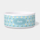 Joli motif floral illustré de fleurs blanches aux tiges vertes et quelques feuilles sur une couleur arrière - plan bleu clair. Il y a aussi une forme ovale en bleu qui a une zone de texte personnalisable pour le nom de l'animal dans une belle police de caractères de script couleur blanche.