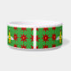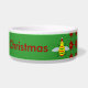 Ce magnifique bol à chien comporte une jolie abeille jaune aux yeux noirs brillants et aux pattes noires. Les antennes sont vertes et les rayures sur l'abeille alternent entre vert et jaune. L'abeille porte un casquette rouge et blanc et semble prête à célébrer Noël. L'arrière - plan est composée de jolies fleurs de poinsettia rouges, chacune avec un centre jaune vif. Il y a du texte personnalisé pour que vous puissiez inclure le nom de votre animal de compagnie.