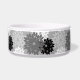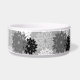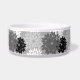Pet bol dans une prise moderne sur un imprimé kimono floral japonais traditionnel - fleurs stylisées dans les tons graphite et gris clair / gris, noir et blanc sur gris moyen arrière - plan