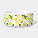 Un bol d'animal avec un mignon motif de citrons jaunes avec des feuilles verts et des tranches de citron fraîchement coupées. Un rectangle blanc superposé avec votre texte à l'intérieur.