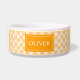 Ce bol pour animal de compagnie présente un motif d'empreintes de pattes de chien blanches sur fond orange clair. Il y a également une bannière orange avec une zone de texte personnalisable pour le nom de l'animal de compagnie.