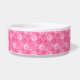 Le bol pour animaux de compagnie est affiché avec une impression de pattes roses. Choisissez de petite ou grande taille. Customisez cet objet ou achetez tel quel.