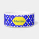 Bol d'eau/nourriture pour chien en céramique blanche, avec un motif en quatrefoil jaune, bleu et blanc, autour de l'extérieur. Un texte jaune ovale, à l'avant du plat, a un texte personnalisé bleu prêt à être personnalisé. Des produits assortis pour animaux de compagnie sont disponibles.