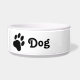 Ce bol pour animaux de compagnie présente une simple silhouette d'empreinte de patte noire avec une zone de texte personnalisable à côté qui indique maintenant un exemple de texte "Chien". L'exemple de texte peut être facilement remplacé par le nom de votre animal, par exemple.