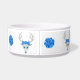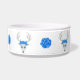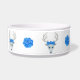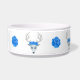 Ce bol de nourriture pour animaux de compagnie est entouré de têtes de cerf blanches fantaisie avec de grands bois blancs, des yeux bleus et des roses sur la tête. De grosses roses bleues sont entre les cerfs.