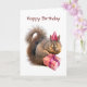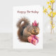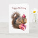 Un écureuil portant un casquette de fête tient un cadeau d'anniversaire emballé sur cette carte d'anniversaire sucrée. "Joyeux anniversaire" ou customisez d'écrire vos propres mots.
