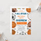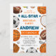 Featuring an All Star design that blends the excitement of various sports, from basketball and soccer to baseball and more, this invitation sets the tone for a day filled with athletic fun and celebration. The vibrant colors and playful graphics make it an engaging and eye-catching choice for your special occasion.