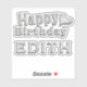 Un très beau autocollant personnalisé pour Edith. Le nom est disponible sous forme de texte et de Happy Birhtday en différentes tailles et en toute transparence. Parfait pour toi, ta meilleure amie, épouse, soeur, mère, tante, grand-mère, fiancée, cousine, partenaire de vie ou qui que tu veuilles faire avec un cadeau personnel et indivubiel. Regarde aussi dans notre magasin pour trouver d'autres produits sous ce nom comme cadeau. Vous trouverez beaucoup d'autres produits et designs personnalisés.