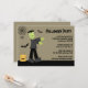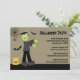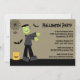 Cet invitation de fête d'Halloween 5x7 a un thème éffrayant mignon. Il y a une araignée accrochée à une toile dans le coin, avec un frankenstein marchant avec deux chauves-souris volant autour. Il y a un joli tour de citrouille ou un sac de gâterie sur la gauche. Vous pouvez facilement customiser les informations de votre parti à droite. Copyright JD Digi Designs