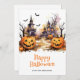 Carte d'Halloween aquarelle avec jack-o-lanternes, chauve-souris et un manoir hanté. Personnalisez facilement cette belle carte d'Halloween avec votre nom de famille et votre texte.