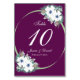 Carte numéro de table pour la suite Mariage Eggplant & Green Floral & Ribbon. Le design comprend un bouquet de fleurs aquarelle reposant sur un lit de pin. Les deux grandes fleurs blanches sont à base d'anémones aux centres bleu marine, une fleur unique parfois utilisée dans les bouquets d'hiver. Fleurs délicates en forme de cloche, bourgeons rouges et feuilles accentuent les grands blancs. Enfin, un ruban vert encadre le texte dans un cercle sur un arrière - plan aubergine.
