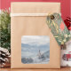 Photo souvenir autocollant de l'église de Saint-Pankraz dans un paysage alpin dans la neige entourée de nuages et de brouillard sur une colline avec vue sur la vallée de Zillertal avec les Alpes montagnes dans l'arrière - plan à Fügen, Autriche en hiver.