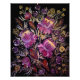 Un tableau vibrant de fleurs lilas sur un arrière - plan sombre dans le style traditionnel Petrykivka. La composition présente des motifs floraux complexes, avec des touches délicates et profondes qui créent un sens du mouvement et de l'élégance. Les fleurs sont entourées de feuilles ornés et de petits détails décoratifs dans les tons verts, jaunes et blancs, contrastant magnifiquement avec le fond sombre.
