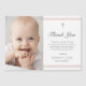 Moderne Elegance Girls Baptism carte de remerciements est moderne et propre avec des rayures roses douces et une croix avec photo. Le dos est un aimant. Type personnalisable gris vous permet de modifier toutes les informations de la carte à votre goût. Parfait pour le baptême d'un petit garçon.