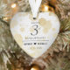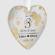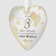 Célébrez le 3e anniversaire du mariage en cuir avec cet ornement commémoratif! Un élégant lettrage noir avec des confettis hexagonaux dorés sur un luxueux arrière - plan en cuir blanc bordé d'un contour stylisé d'un coeur en feuille d'or feuilleté apporte une touche mémorable à cette occasion spéciale et à cette étape. Customisez avec les noms du couple et la date du mariage. Reverse affiche un design identique. Design © W.H. Sim. Voir plus sur zazzle.com/expressionsoccasions