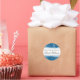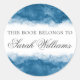 Étiquettes de livres élégants et tendance ou autocollants de plaques d'écussons bleu avec des bordures d'aquarelle haut et bas. Texte gris foncé personnalisable : "Ce livre appartient à [Nom de famille]"