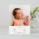 Annoncez votre lot de joie avec style ! Cette conception simple mais élégante de faire-part de naissance comprend une photo verticale, le nom de votre bébé et les statistiques de naissance dans une table simple. Le contour de la table et les noms de votre bébé sont imprimés en papier presse. Tous les autres textes sont imprimés à plat en noir. Le dossier est une bande blanche et grise classique qui peut être facilement retiré ou customisé. Vous pouvez customiser ce design en ajoutant une autre photo à l'arrière. Modifiez simplement le modèle avec vos coordonnées (nom de votre bébé, état de naissance et nom). Simple, chic et moderne ! Le pétrole est disponible en or, argent ou or rose et brille absolument !