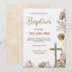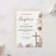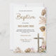 "Elegant baptism invitation featuring floral accents and a cross on a white background. Text includes details of the event and RSVP information."