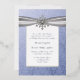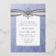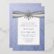 Chic invitation de mariage d'hiver faite dans un arrière - plan damassé bleu glace. Les graphismes d'un ruban argenté à l'aspect satiné blanc, court sur le dessus de la zone de texte blanc et est décoré, au milieu, avec un ton argenté et diamant à l'aspect bijou flocon de neige. Personnalisez le vrai texte en papier argenté pour répondre à vos besoins.