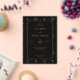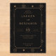 This elegant wedding invitation features a sophisticated black and gold color palette, creating a luxurious and timeless look. The design showcases celestial motifs with stars and sun-like symbols arranged in a harmonious grid pattern on the deep black background. Ornate gold borders frame the central text area, which is written in bold serif fonts that enhance the formal and classic aesthetic. Perfect for a grand celebration, this invitation conveys an atmosphere of sophistication and anticipation, making it ideal for couples seeking a vintage-inspired yet modern touch for their special day.