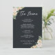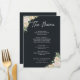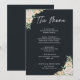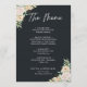 This elegant black wedding menu template features soft white and blush floral accents for a sophisticated and timeless look. The modern script typography highlights each course beautifully, perfect for formal receptions, garden weddings, or evening celebrations. Easily personalize with your own text and menu details. A chic and stylish addition to your wedding table decor, ideal for printing or digital display.