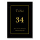 Un élégant mariage noir encadré d'or numéro de table avec imprimé or. Le nom de la mariée et du marié ainsi que leur date de mariage figurent également sur la carte.