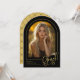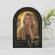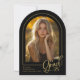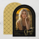 Un classique noir et or faire-part photo graduation mais avec une touche moderne. FRONT : "Grad" est montré dans un script manuscrit tendance et recouvre partiellement la photo en forme d'arc. Personnalisez le modèle avec la photo de votre élève, les prénoms et prénoms, le nom de l'école et les derniers deux chiffres de leur année de graduation. RETOUR : Un élégant motif géométrique avec arcs (avec possibilité de supprimer). © Kimbellished, LLC