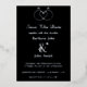 This elegant black Save The Date card features a striking white ink aesthetic on a solid dark background. The design showcases a unique interlocking rings illustration forming a heart symbol, perfect for modern couples. Written in a blend of sophisticated calligraphy and clean serif fonts, it clearly displays the wedding date, time, and location at Queensland Gardens. Ideal for a minimalist wedding theme, this high-contrast invitation ensures your announcement stands out with a monochrome and luxury feel. The back is customizable for additional details