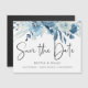 Elégante aquarelle bleu poussiéreux et arrangement floral marine, mariage enregistrer la date aimant. La carte est dotée d'un élégant script de calligraphie "Save the Date".