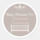 Élégant chandelier Baby shower Classic Round Sticker. Ces adorables autocollants de baby shower célèbrent une petite fille avec un arrière - plan rose clair, blanc et marron décoré d'un lit d'enfant blanc et d'un lustre.