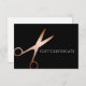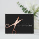 Design moderne et élégant pour coiffeurs avec ciseaux d'or faux rose, police calligraphie élégante et arrière - plan noir.