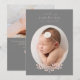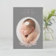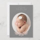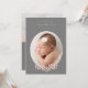 Cette faire-part de naissance élégante et élégante dispose d'une seule photo ovale sur le devant avec des détails typographiques classiques pour le nom du bébé et des statistiques incluant la date de naissance, le poids et la longueur. Fleur pastel doux, détails dans un pastel de corail rose vif et points bleus doux. Le côté arrière comprend un espace pour un message de famille personnalisé en option et une grande photo rectangulaire seconde.