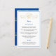 Cet élégant menu de réception de mariage côtier présente un élégant coquillage d'or et des vagues au design élégant avec une bordure bleue. Renverse à motif de coquillages d'or sur arrière - plan bleu. Parfait pour les mariages de plage, d'été ou de sports nautiques. Design©Rosalind Moore, Cherry Lane Designs.