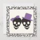 Elégant crâne Halloween violet faire-part de mariage, avec un couple de crâne noir marié et marié sur l'arrière - plan ivoire et une bordure motif crâne. Le marié porte un casquette violet et la mariée un arc violet. Vous voulez de l'aide ou un autre jeu de couleurs ? Cliquez simplement sur le bouton Contact sous le produit et demandez-le!