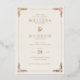 This elegant wedding invitation features a classic rectangular layout with a vertical orientation, centered text, and decorative floral motifs in the corners. The soft cream background is complemented by gold accents, creating a sophisticated and warm atmosphere. The design incorporates ornate flourishes and botanical elements that frame the central text, enhancing its theme of celebration and elegance. With a mix of serif fonts, it balances formality and readability, making it perfect for a refined wedding event.