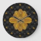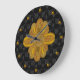 Horloge murale chic faite en noir sur motif damassé floral noir. Des graphismes élégants de clous d'or représentent les chiffres, autour du bord, et une belle décoration de style Art Déco couleur or au milieu de l'horloge. Customisez pour ajouter du texte. Jolie horloge pour n'importe quelle chambre de la maison ou du bureau.
