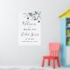 Bienvenue dans votre mariage avec l'Affiche de bienvenue Elégante Dusty Blue Boho Fête des mariées, avec une végétation botanique luxuriante et des fleurs blanches, avec "bienvenue à notre bonheur toujours après", vos noms, et rendez-vous mariage dans un mélange chic de caractères modernes de bloc et de calligraphie lettrée à la main.