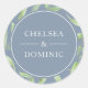 Étiquette Dusty bleu mariage modèle où vous pouvez créer votre propre auto-collant de nom de mariée et de mariée personnalisée pour compléter vos faveurs de mariage bleu poussiéreux. Ajoutez une touche élégante à vos faveurs, cadeaux et invitations avec ces stickers minimalistes feuille d'aquarelle design et verdure.