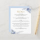 Ajoutez une touche de sophistication à vos tables d'accueil avec cette carte de menu mariage élégante, avec des flores bleu poudreuse et des accents dorés délicats. Parfait pour les mariages romantiques, de jardin ou classiques, ce menu s'harmonise parfaitement avec la collection de Mariages en Poudre Bleu et Or.