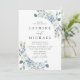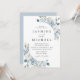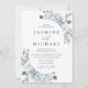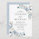 Élégantes invitations à des mariages fleuris avec vos détails mariages entouré d'un cadre ovale avec des roses bleu et blanc poussiéreux, des hydrangées, des feuilles d'eucalyptus et de la verdure. Ce faire-part de mariage floral bleu poussiéreux conviendra parfaitement à votre mariage de printemps ou d'été !