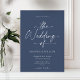 Ce faire-part de mariage de marine sophistiqué présente un design élégant avec une police de calligraphie moderne. L'arrière - plan de marine profonde crée un look intemporel et élégant, parfait pour un mariage romantique et élégant. Personnalisez-le avec vos détails pour une touche magnifiquement customisée. Idéal pour des thèmes mariages classiques, classiques et contemporains.
