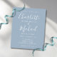 Elégante faire-part de mariage de signature bleu poussiéreux avec des noms de style signature, cette élégante faire-part de mariage bleu et blanc poussiéreux peut être personnalisée avec vos informations en lettrage blanc chic. Conçu par Thisisnotme©