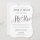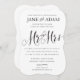 Simple, élégant, belle typographie de script noir et blanc Mr et Mme Wedding Invitations. Personnalisez-les vous-même ici et maintenant en ligne avec vos propres détails mariages. Il suffit de taper l'exemple de texte ci-dessus à droite avec vos propres détails d'invitation de mariage et vous verrez les mots changer immédiatement à l'écran. Si vous souhaitez déplacer ou modifier la taille/le placement de la police, etc..., cliquez sur personnaliser. Chaque invitation est accompagnée d'une enveloppe blanche de taille équivalente incluse dans le coût.